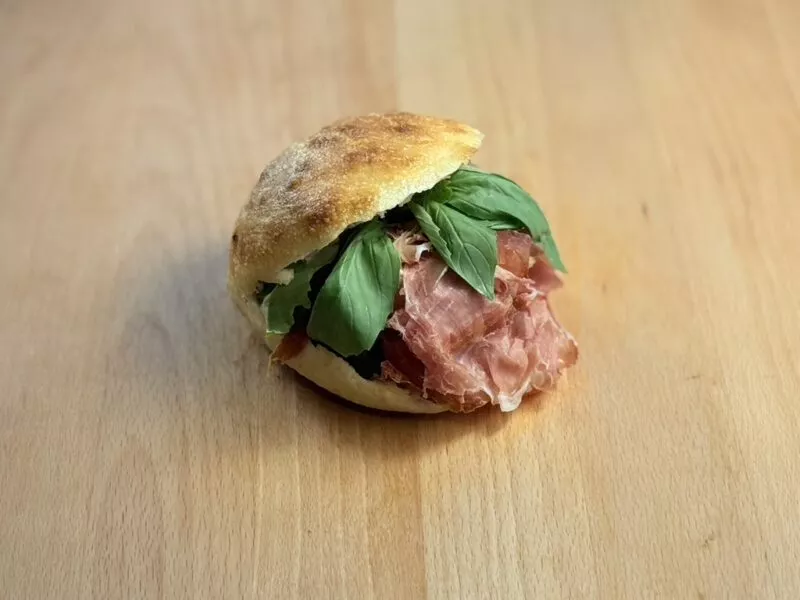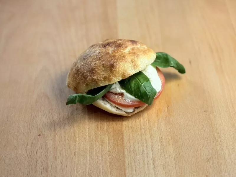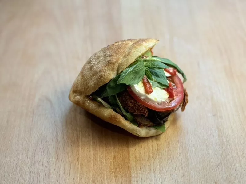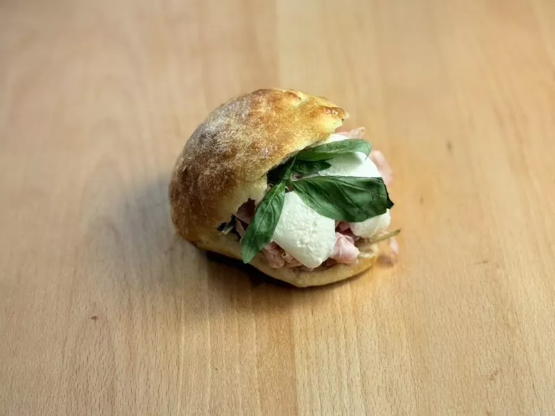 pesto pistache, bufala, misticanza, mortadella, tomate