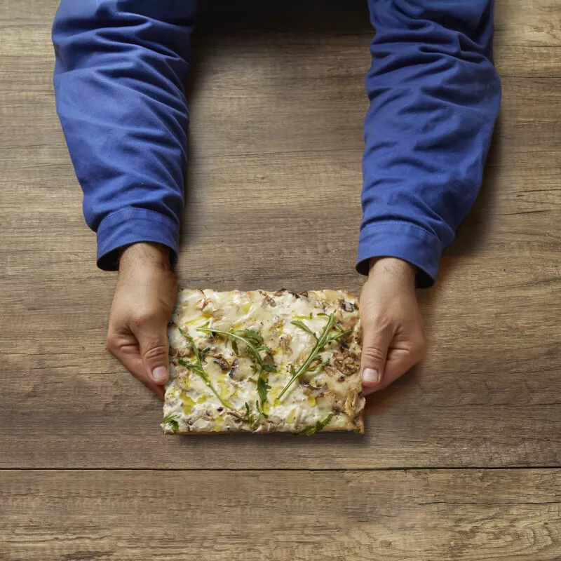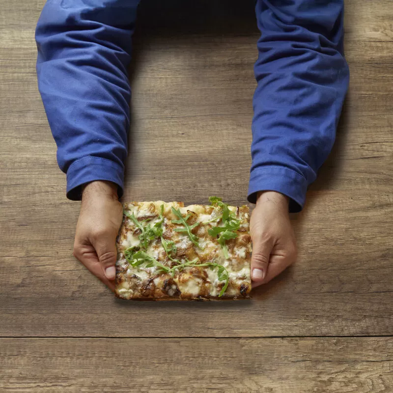 Oignons confits, thym, mozzarella, gorgonzola, roquette