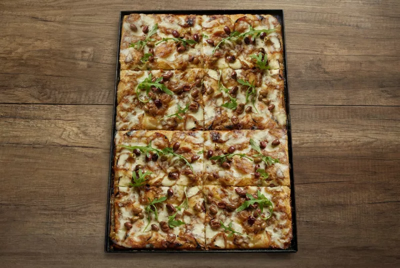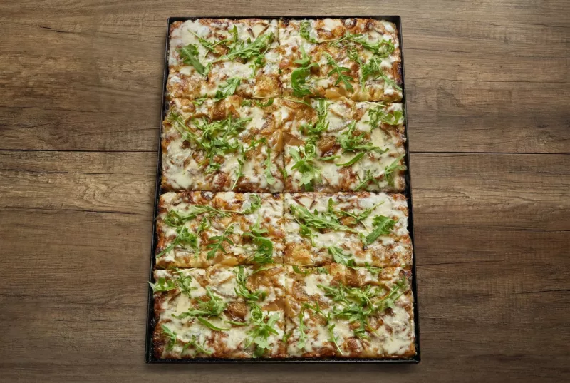 Oignons confits, thym, mozzarella, gorgonzola, roquette