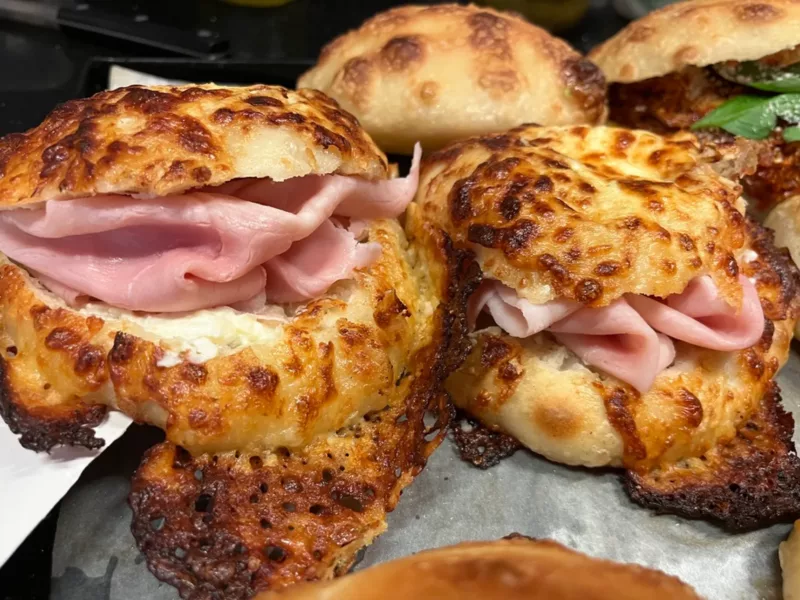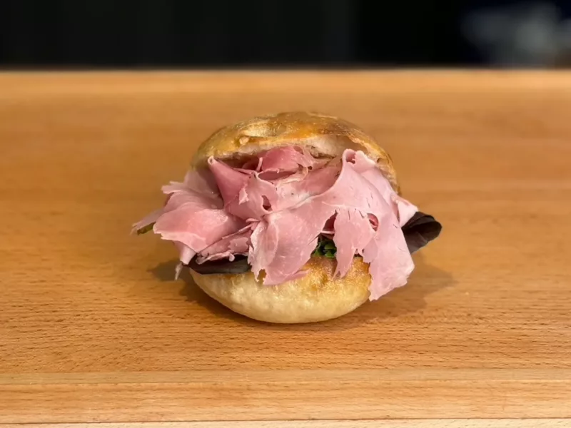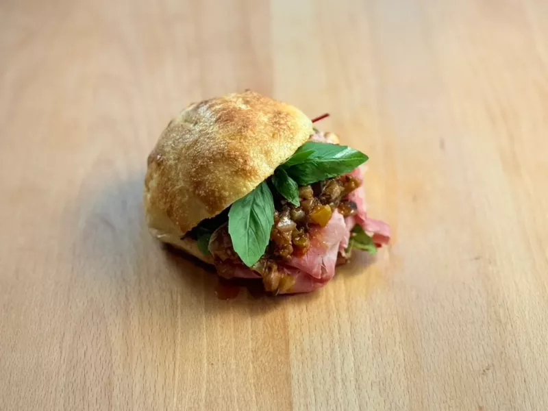 pesto pistache, bufala, misticanza, mortadella, tomate