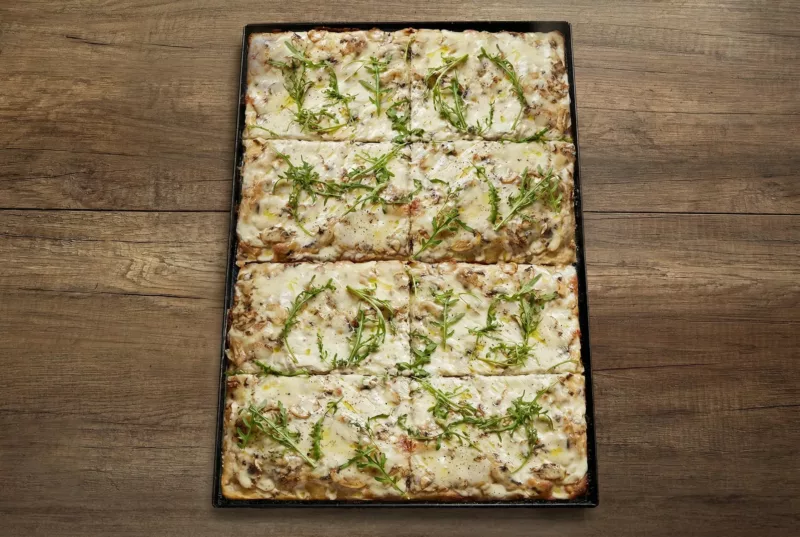 Champignons, mozzarella, crème parfumée à l'huile de truffe blanche, roquette